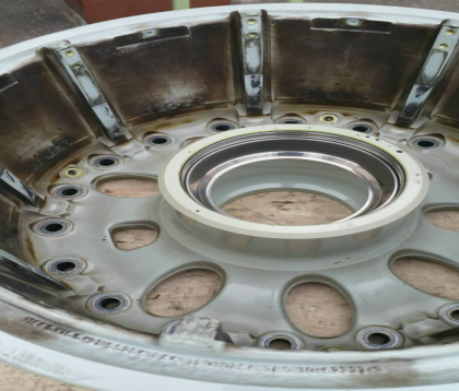 ![]() 需要翻新处理的飞机轮毂外形尺寸:Φ450-700*H140-400mm (看看,才几天的飞行,飞机起降对轮胎、轮毂的冲击有多大!) 喷砂后接受探伤检测时的轮毂,让损伤一览无余!